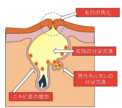 - 男性ホルモンなどの影響により皮脂分泌が活発になること