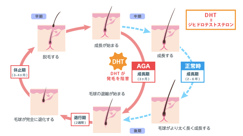 男性型脱毛症(AGA)の主な原因物質は毛根部のDHT(ジヒドロテストステロン)です。 AGAでは脱毛部分に多量のDHTが確認されています。男性ホルモンであるテストステロンから5α-還元酵素によってDHTは作られ、このDHTが多くできると頭髪の成長期が終了します。そのため頭髪が太い毛に成長する前に抜けてしまい、細くて短い頭髪が多くなって薄毛の状態になっていきます。