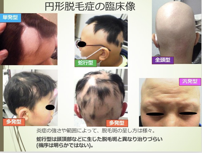 脱毛斑が1つだけの「単発型」や、複数発生する「多発型」のほか、後頭部から側頭部の髪の毛の生え際にかけて不整形の脱毛がみられる「蛇行型」、頭髪がほぼすべて抜けてしまう「全頭型」などのタイプがあります。
