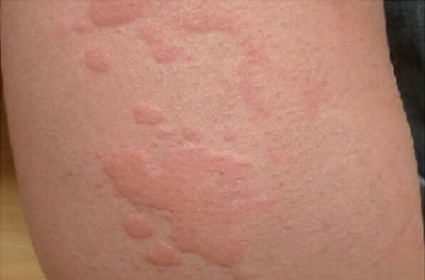 蕁麻疹は、虫に刺されたようなみみずばれ(膨疹と言います)が突然あらわれ、多くはかゆみを伴う皮膚の病気です。