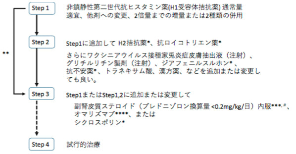治療内容は、蕁麻疹の症状と効果に応じてステップアップし、症状軽減が見られれば原則として患者負担の高いものから順次減量、中止する。