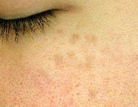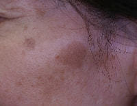 思春期以降に濃くなり中高年になると目立たなくなってきます。紫外線・妊娠で濃くなることもあります。1~5mmの褐色斑が両頬~鼻の付け根に多発します。顔面全体に生じる場合も少なくありません。