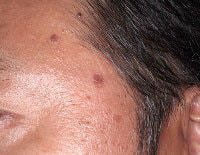 日光露出部に生じる茶色いできもので紫外線の関与が言われています。2~20mmぐらいの類円形で少し隆起しています。年齢が上がるとともに徐々に増えていき、60歳を超えるとほとんどの人に出現すると言われています。