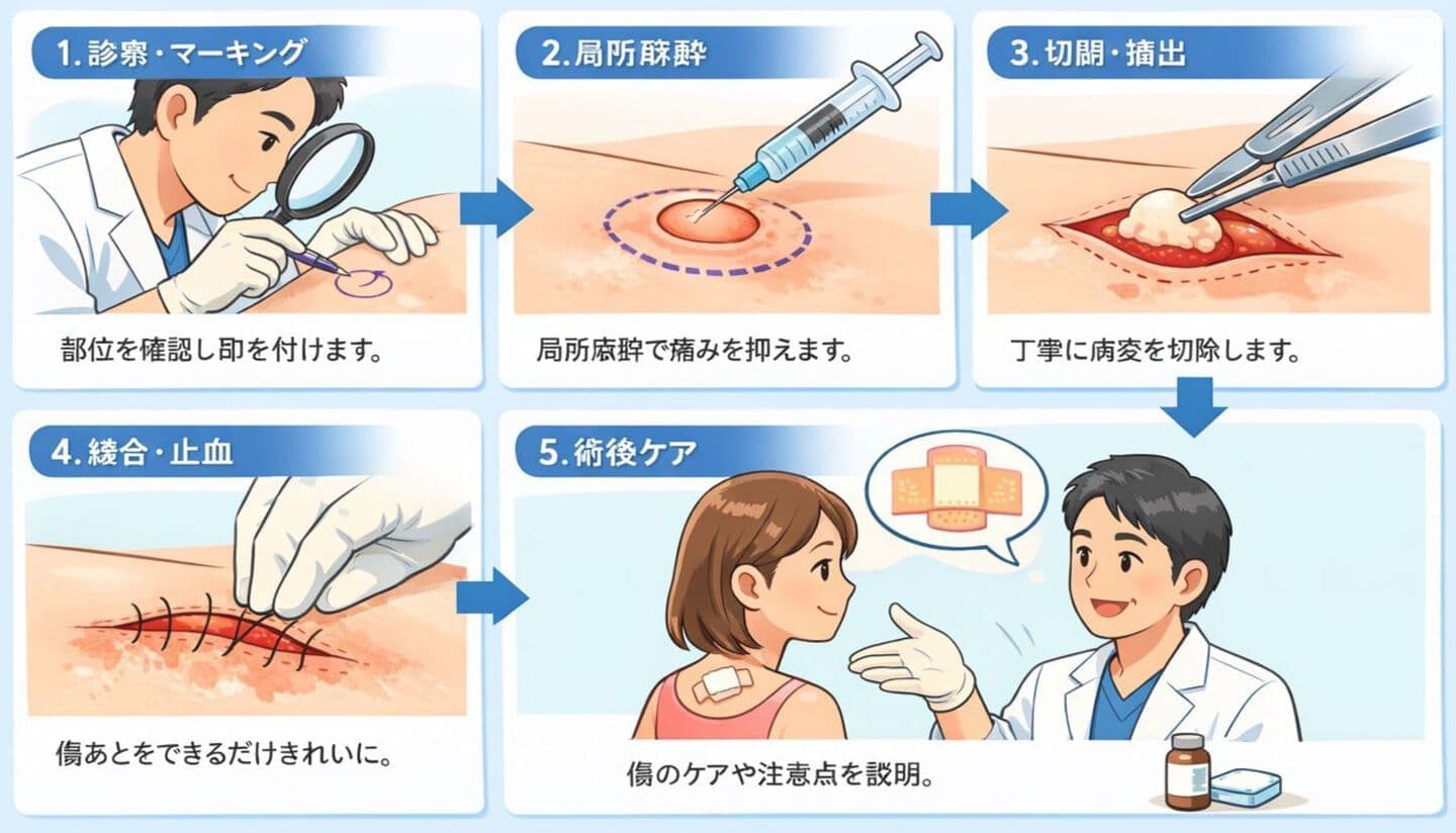 粉瘤(アテローム)や皮膚腫瘍、ほくろなど、日帰りで行える皮膚科手術を中心に、安全性と仕上がりの美しさの両立を大切にしています。